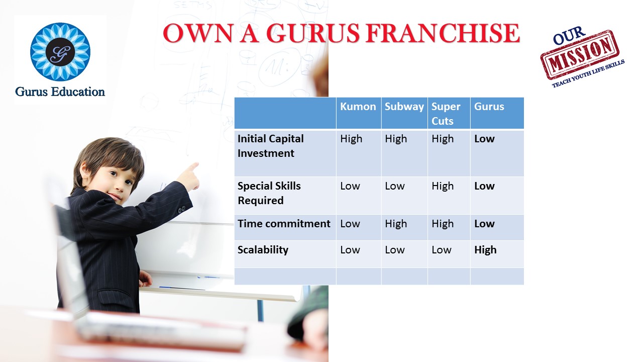 Gurus Education franchise opportunities are available nationwide* Gurus Education is a fast-growing company in the after-school industry. With over 150 locations all over the bay area, Gurus have taught thousands of youth, life-skills. Gurus have programs in Public Speaking with Confidence, Debates, Personal Finance and Medical Kids.